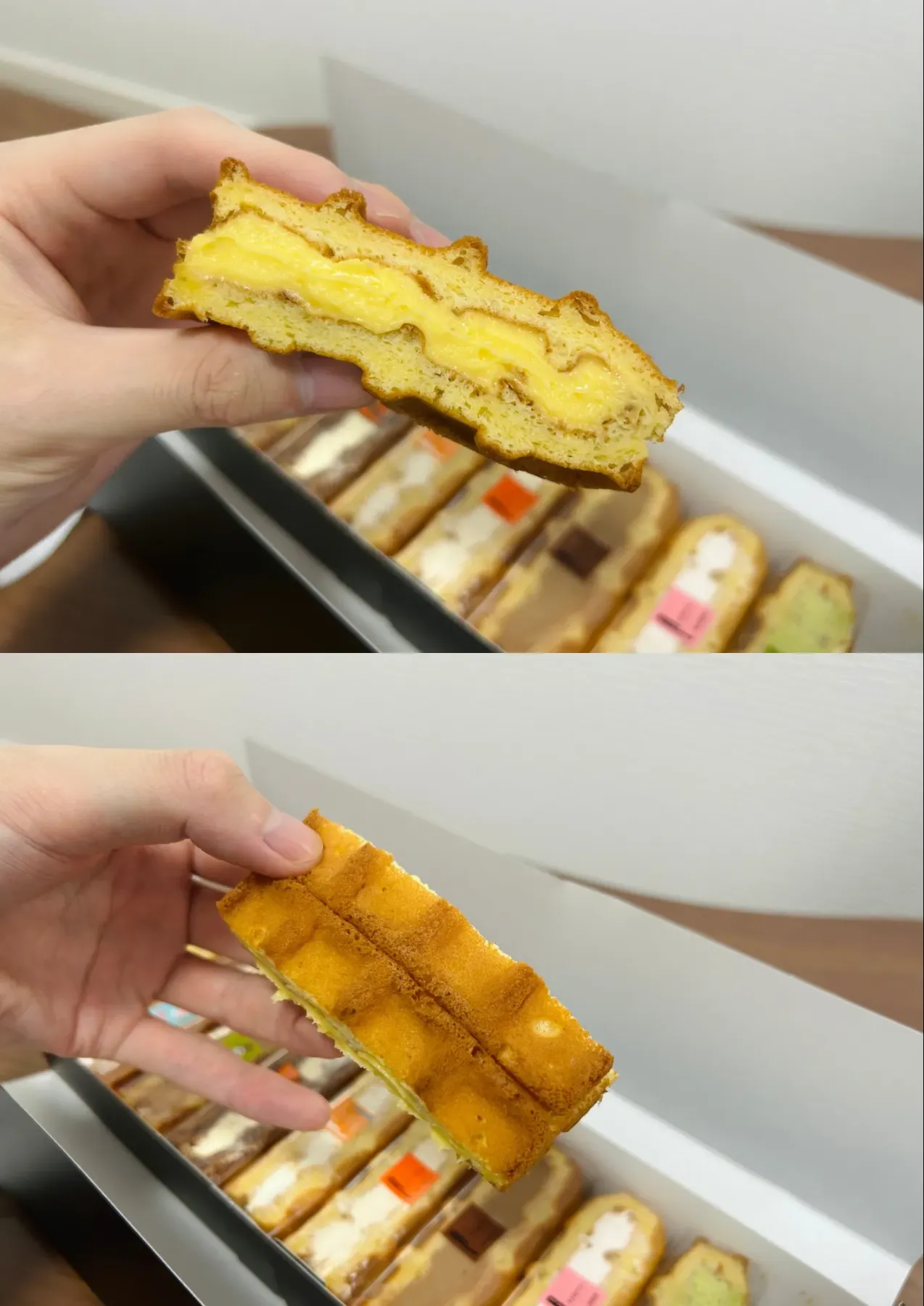上記写真はシンプルなプレーンで、なめらかなカスタードクリームの入った王道の味です。手ごろなサイズ感のワッフルは食べ出したら止まりません。