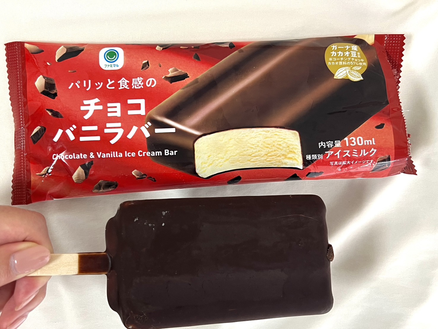 ファミリーマートの「パリッと食感のチョコバニラバー」を実際に購入して味をレビューします!バニラアイスをリニューアルした商品、さらに美味しくなったと話題です。味や食感などの特徴を徹底解説。気になる方はぜひチェックして。
