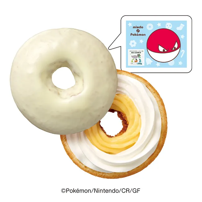 ![]() | タマゲた! ビリリダマのドーナツ ホワイト | ケーキドーナツにホワイトチョコをかけ、カスタードとホイップをサンド。ビリリダマデザインのスリーブ入りで、見た目もインパクト大。 | テイクアウト:226円 イートイン:231円 |