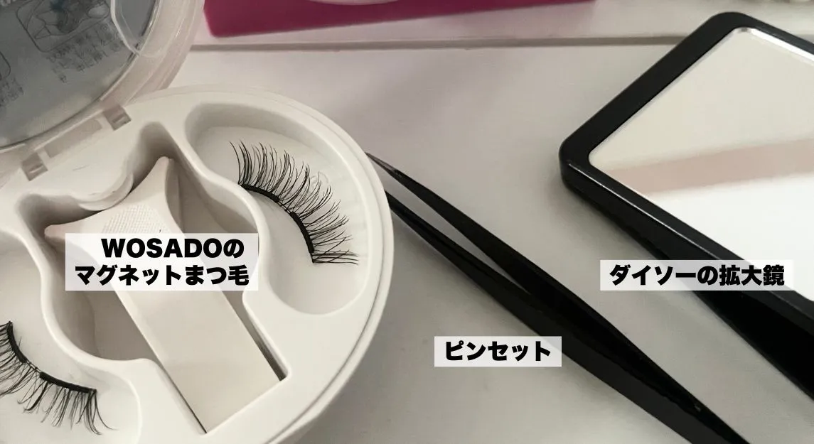ワタシがマグネットつけまつ毛をつける際に使っているのはピンセットとダイソーの拡大鏡です。ピンセットと拡大鏡を駆使することで装着の手間がぐんと省けます。