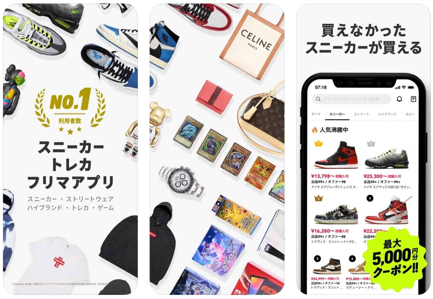 500万人以上が利用する、国内最大級のスニーカーフリマアプリ。「世界が熱狂するマーケットプレイスを作る」という理念で立ち上がった会社が運営しています。インターネットで売るのが不安なプレミア価値がつくものも、鑑定士がいるこのアプリなら安心して出品することができます。