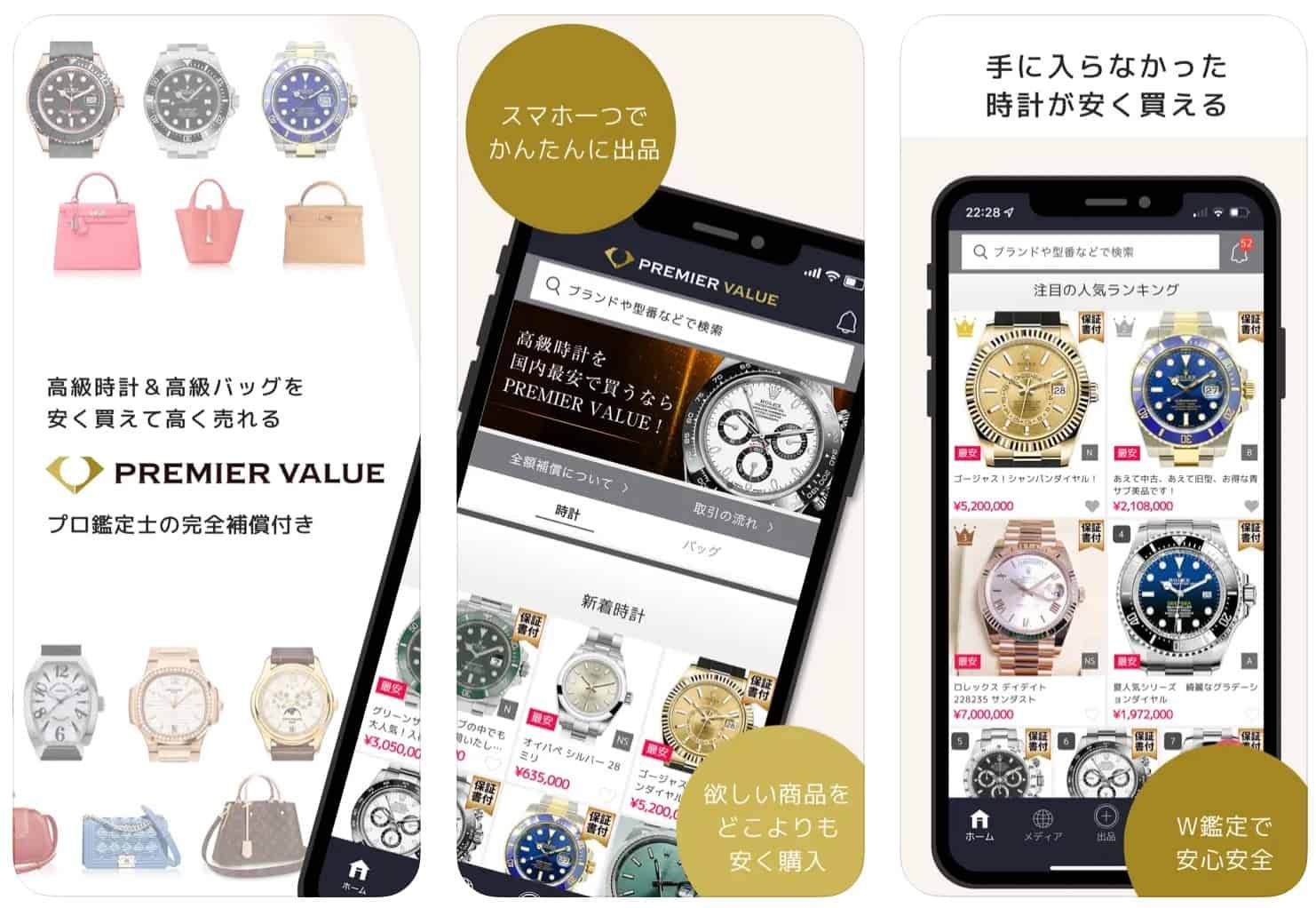 プレミア・バリューは、高級時計・高級バックに特化したアプリです。オンラインで出品して購入者がつくのを待つフリマアプリですが、プロのバイヤーが間に入り、状態のチェックや査定を行うため、安心して取引を行うことができます。