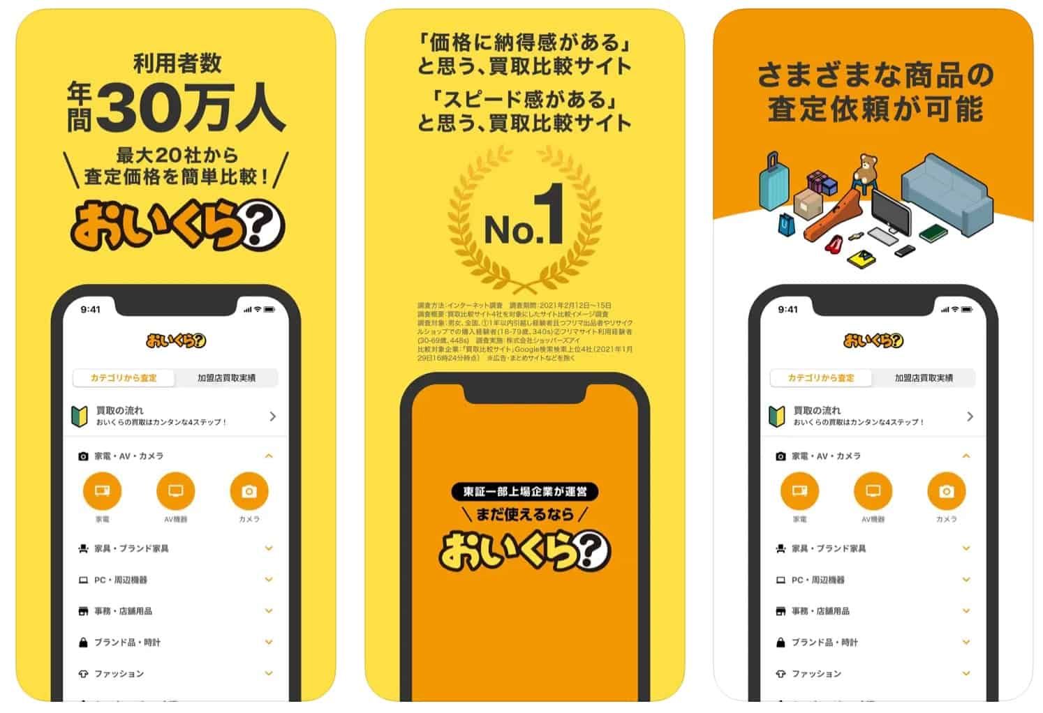 全国の1000店舗以上の店舗が加盟し、一度に最大20社から査定をもらうことができるアプリです。査定をもらったらそのままアプリで買取依頼ができるので、できるだけ高くかつスムーズに売りたい人におすすめです。