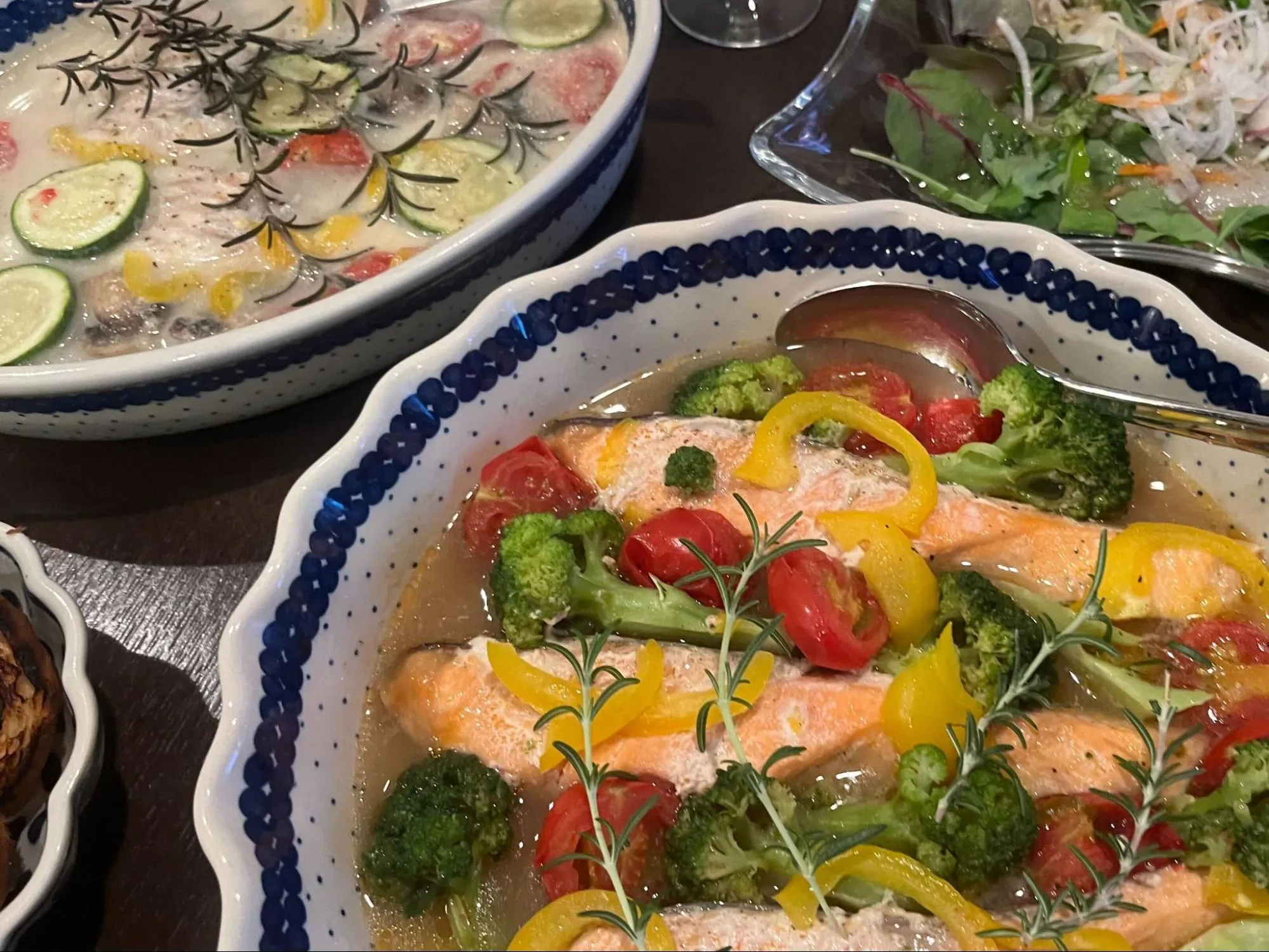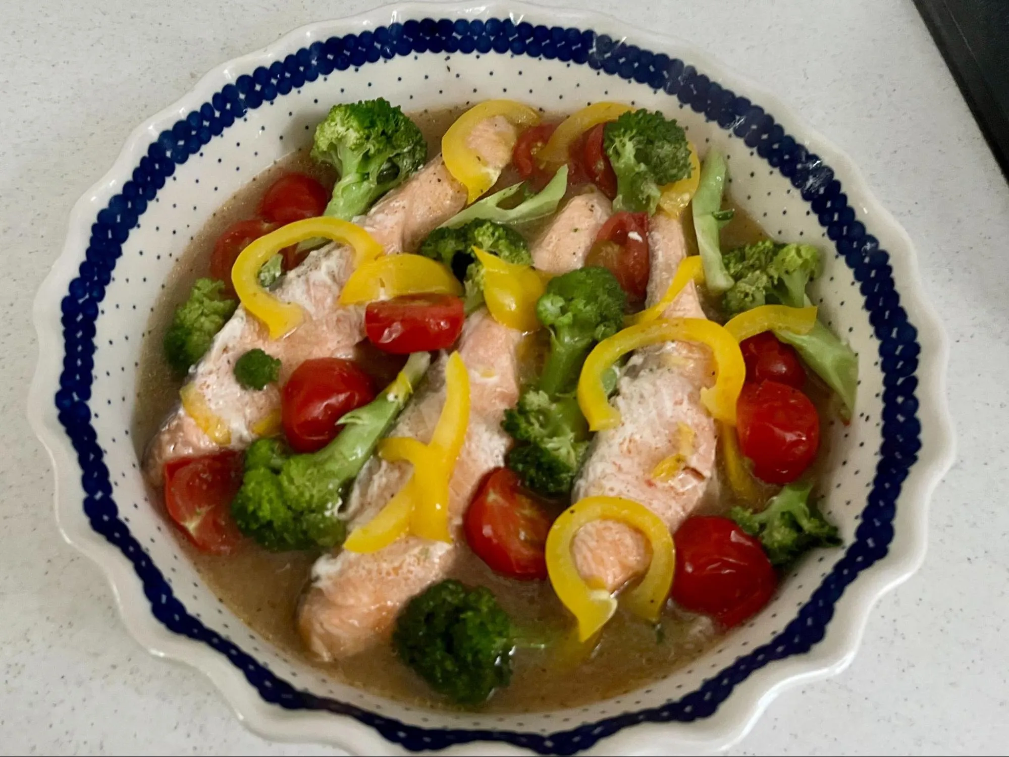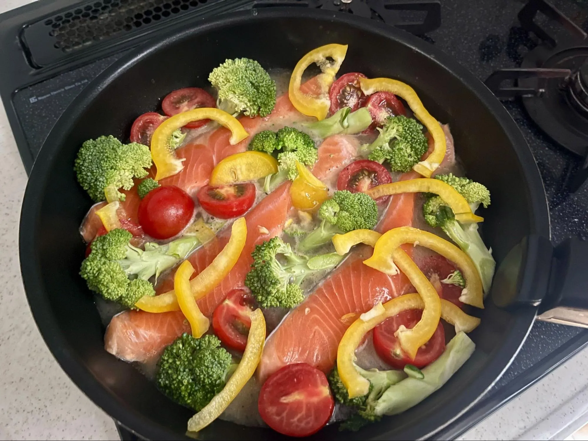 フライパンに鮭とミニトマト、ブロッコリー、パプリカを入れて煮込むと、ガーリックの香ばしい香りが立ちのぼり、キッチンが一気に地中海ムードに包まれます。