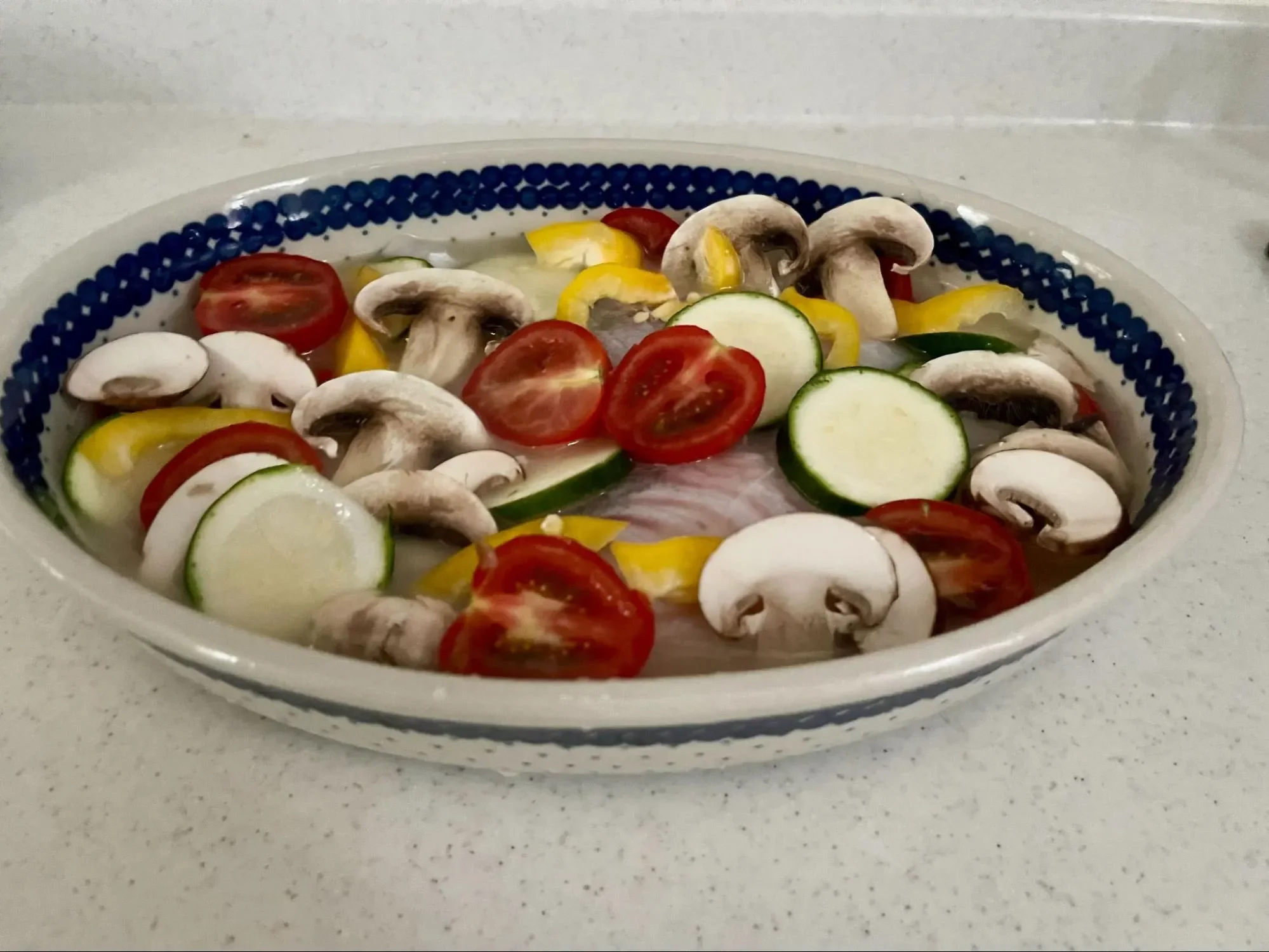 材料をカットします。深めの耐熱容器に、アクアパッツァの素、水、白身魚の切り身、ズッキーニ、ミニトマト、マッシュルーム、黄パプリカを入れます。