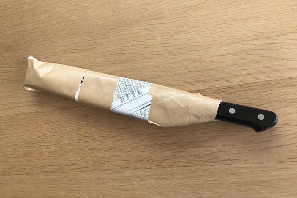 それでは、実際に包丁を丈夫な紙で包む工程をやっていきましょう!ポイントは新聞紙を使うこと。