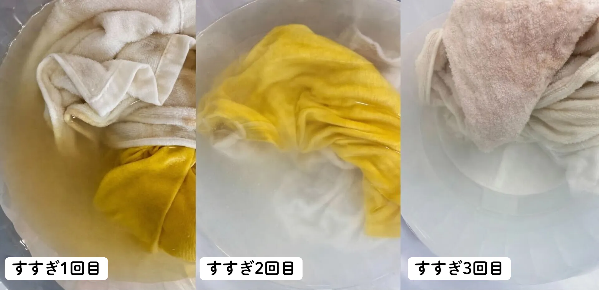 泡立ちは控えめな印象。写真は、洗い工程後、すすぎ1回目→すすぎ3回目の様子ですが、すすぎ2回目でかなりクリアになり、汚れが落ちているのが分かりました。