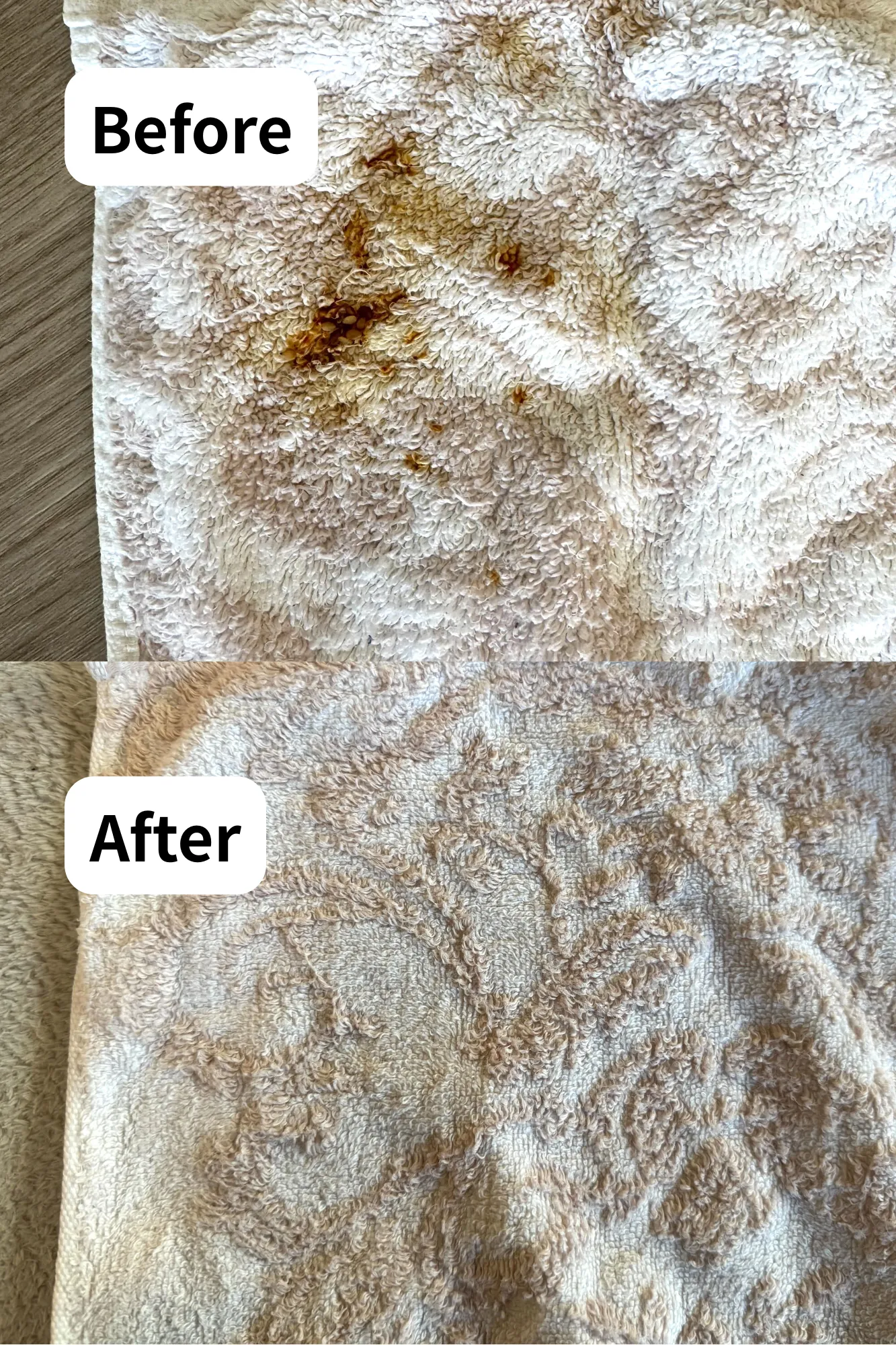 こちらも問題なくきれいに落ちました。実はこのタオル、汚れてから数日経ってから洗ったもの。染みついているかと思いましたが、気になる汚れは残っていません。