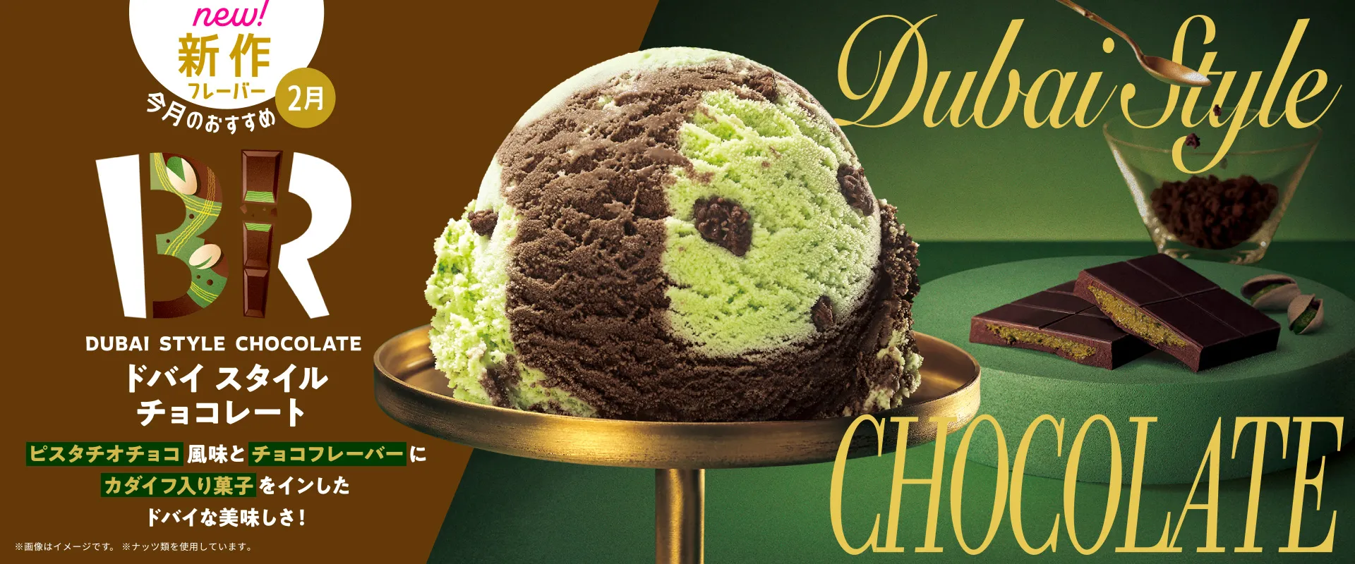 サーティワンの新作フレーバーは、ピスタチオとチョコの濃厚な味わいが楽しめる「ドバイ スタイルチョコレート」。