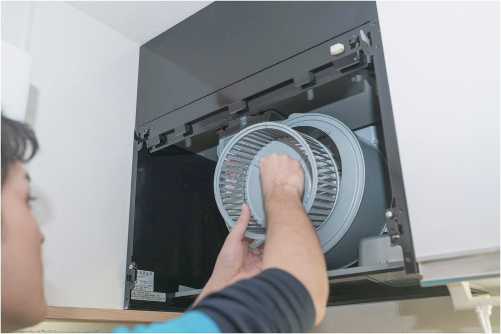 \u003C/p>\n\u003Cp>キッチンに備え付けてある換気扇には、主に3種類あります。\u003C/p>\n\u003Cp>それぞれ、分解方法が違うので、まずは換気扇の形をチェックしてみてください。\u003C/p>\n\u003Ch3>ドラム式換気扇\u003C/h3>\n\u003Cp>\u003Cstrong>最近のキッチンでは主流。\u003C/strong>\u003C/p>\n\u003Cp>換気扇フィルターの中にカタツムリの殻のような形をしたドラムがあるもので、内部には円形のシロッコファンという無数の羽が付いています。\u003C/p>\n\u003Ch3>プロペラ式換気扇\u003C/h3>\n\u003Cp>昔ながらの換気扇。\u003C/p>\n\u003Cp>4枚ほどの羽がついたプロペラが中央にあり、扇風機のように回転して吸気するもの。\u003C/p>\n\u003Ch3>アイランド型換気扇\u003C/h3>\n\u003Cp>最近の換気扇ではアイランド型と呼ばれる煙突のついた特殊な換気扇があります。\u003C/p>\n\u003Cp>アイランド型の分解して掃除するには、専門的な知識が必要なので、専門業者へ相談するのがおススメ。\u003C/p>\n\u003Ch2>\u003Cspan id=\"i-2\">分解してみましょう!\u003C/span>\u003C/h2>\n\u003Cp>\u003Cimg class=\"wp-image-126722\" src=\"https://p.ymcdn.jp/ho/relivers/wp-content/uploads/2020/10/d26979e3ad4bb51f3437c1de22eaa996-4-600x400.jpg\" alt=\"\" srcset=\"https://p.ymcdn.jp/ho/relivers/wp-content/uploads/2020/10/d26979e3ad4bb51f3437c1de22eaa996-4-600x400.jpg 600w, https://p.ymcdn.jp/ho/relivers/wp-content/uploads/2020/10/d26979e3ad4bb51f3437c1de22eaa996-4-300x200.jpg 300w, https://p.ymcdn.jp/ho/relivers/wp-content/uploads/2020/10/d26979e3ad4bb51f3437c1de22eaa996-4-768x512.jpg 768w, https://p.ymcdn.jp/ho/relivers/wp-content/uploads/2020/10/d26979e3ad4bb51f3437c1de22eaa996-4.jpg 1000w\" sizes=\"(max-width: 600px) 100vw, 600px\" />\u003C/p>\n\u003Cp>ドラム式とプロペラ式では若干手順は変わりますが、大体の分解手順は同じですので、一緒に手順を説明していきますね♪\u003C/p>\n\u003Cdiv class=\"how-to-title\">キッチン換気扇分解の手順\u003C/div>\n\u003Cdiv class=\"how-to-border\"> \u003C/div>\n\u003Cdiv class=\"how-to-block\">\n\u003Cdiv class=\"how-to-number\">1\u003C/div>\n\u003Cdiv class=\"how-to-text\">電源プラグを抜く\u003C/div>\n\u003C/div>\n\u003Cp>\u003Cimg class=\"wp-image-126717\" src=\"https://p.ymcdn.jp/ho/relivers/wp-content/uploads/2020/10/2c26ac319296400278ba3c7968e0f99d-600x400.jpg\" alt=\"\" srcset=\"https://p.ymcdn.jp/ho/relivers/wp-content/uploads/2020/10/2c26ac319296400278ba3c7968e0f99d-600x400.jpg 600w, https://p.ymcdn.jp/ho/relivers/wp-content/uploads/2020/10/2c26ac319296400278ba3c7968e0f99d-300x200.jpg 300w, https://p.ymcdn.jp/ho/relivers/wp-content/uploads/2020/10/2c26ac319296400278ba3c7968e0f99d-768x512.jpg 768w, https://p.ymcdn.jp/ho/relivers/wp-content/uploads/2020/10/2c26ac319296400278ba3c7968e0f99d.jpg 1000w\" sizes=\"(max-width: 600px) 100vw, 600px\" />\u003C/p>\n\u003Cp>掃除中の誤作動や通電による事故を防ぐため、はじめに必ず電源プラグを外しましょう。電源スイッチがある換気扇の場合には、電源をOFFにしてから電源プラグを外してくださいね!\u003C/p>\n\u003Cdiv class=\"how-to-block\">\n\u003Cdiv class=\"how-to-number\">2\u003C/div>\n\u003Cdiv class=\"how-to-text\">外側から外せるパーツを外していく\u003C/div>\n\u003C/div>\n\u003Cp>\u003Cimg class=\"wp-image-126718\" src=\"https://p.ymcdn.jp/ho/relivers/wp-content/uploads/2020/10/9f2d0ebffd636f5a44045a907bcfc3c9-600x400.jpg\" alt=\"\" srcset=\"https://p.ymcdn.jp/ho/relivers/wp-content/uploads/2020/10/9f2d0ebffd636f5a44045a907bcfc3c9-600x400.jpg 600w, https://p.ymcdn.jp/ho/relivers/wp-content/uploads/2020/10/9f2d0ebffd636f5a44045a907bcfc3c9-300x200.jpg 300w, https://p.ymcdn.jp/ho/relivers/wp-content/uploads/2020/10/9f2d0ebffd636f5a44045a907bcfc3c9-768x512.jpg 768w, https://p.ymcdn.jp/ho/relivers/wp-content/uploads/2020/10/9f2d0ebffd636f5a44045a907bcfc3c9.jpg 1000w\" sizes=\"(max-width: 600px) 100vw, 600px\" />\u003C/p>\n\u003Cp>レンジフードがある場合には、レンジフードを外しましょう。\u003C/p>\n\u003Cp>レンジフードの下部や左右にあるネジをゆるめて外します。\u003C/p>\n\u003Cp>レンジフードが大きく重い場合には、1人で無理をせずに、2人で取り外しましょう。\u003C/p>\n\u003Cp>ドラム式はシロッコファンの外れ防止の器具を外し、プロペラ式は換気扇のカバーを外します。\u003C/p>\n\u003Cdiv class=\"how-to-block\">\n\u003Cdiv class=\"how-to-number\">3\u003C/div>\n\u003Cdiv class=\"how-to-text\">ファンやプロペラが固定されている器具を外す\u003C/div>\n\u003C/div>\n\u003Cp>\u003Cimg class=\"wp-image-126719\" src=\"https://p.ymcdn.jp/ho/relivers/wp-content/uploads/2020/10/91e97941778a4c4b368687b93475c73a-600x400.jpg\" alt=\"\" srcset=\"https://p.ymcdn.jp/ho/relivers/wp-content/uploads/2020/10/91e97941778a4c4b368687b93475c73a-600x400.jpg 600w, https://p.ymcdn.jp/ho/relivers/wp-content/uploads/2020/10/91e97941778a4c4b368687b93475c73a-300x200.jpg 300w, https://p.ymcdn.jp/ho/relivers/wp-content/uploads/2020/10/91e97941778a4c4b368687b93475c73a-768x512.jpg 768w, https://p.ymcdn.jp/ho/relivers/wp-content/uploads/2020/10/91e97941778a4c4b368687b93475c73a.jpg 1000w\" sizes=\"(max-width: 600px) 100vw, 600px\" />\u003C/p>\n\u003Cdiv class=\"how-to-block\">\n\u003Cdiv class=\"how-to-number\">4\u003C/div>\n\u003Cdiv class=\"how-to-text\">ファンやプロペラをまっすぐ前面へ引っ張って取り外す\u003C/div>\n\u003C/div>\n\u003Cp>\u003Cimg class=\"wp-image-126720\" src=\"https://p.ymcdn.jp/ho/relivers/wp-content/uploads/2020/10/97ad7f9219be1a561177147ca4741c2c-600x400.jpg\" alt=\"\" srcset=\"https://p.ymcdn.jp/ho/relivers/wp-content/uploads/2020/10/97ad7f9219be1a561177147ca4741c2c-600x400.jpg 600w, https://p.ymcdn.