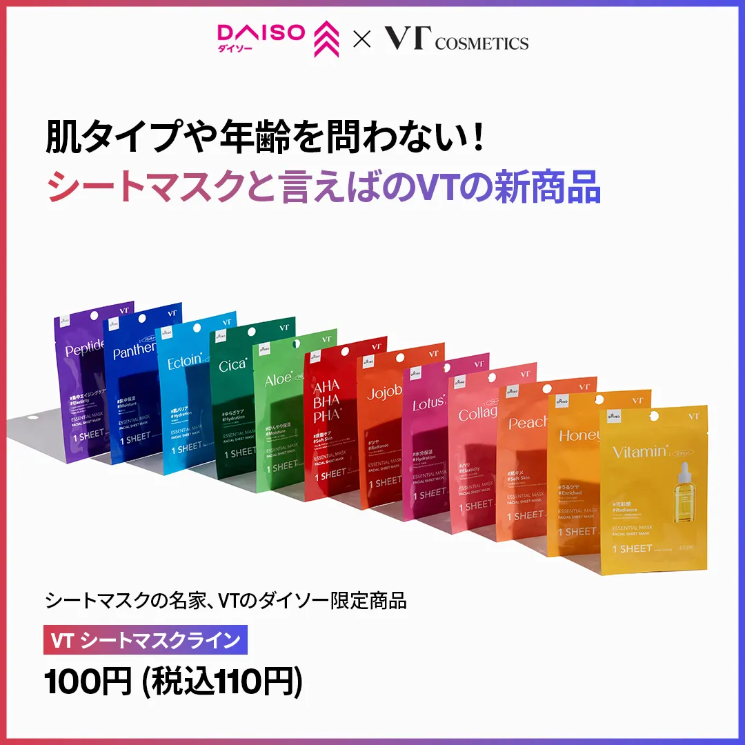 ![]() | VT エッセンシャルマスク | 1枚入 | 110円 | デイリー使いしやすいシートマスク。選べる12成分展開 |
