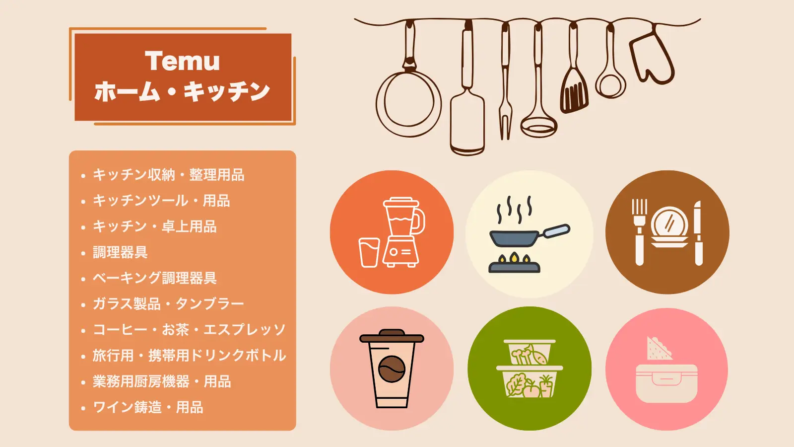 Temuではキッチン用品の取り扱いも豊富。カテゴリ一覧から「ホーム・キッチン」を選択すると関連商品が探せるほか、フィルターで下記のジャンルが絞り込み検索できます。