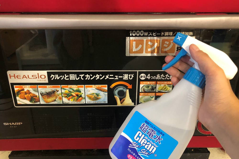 ここからは超電解水クリーンシュシュを実際に使って、油汚れの掃除をしていきます。今回用意したのは、約10年間使って1度も掃除していないであろう電子レンジの扉です。