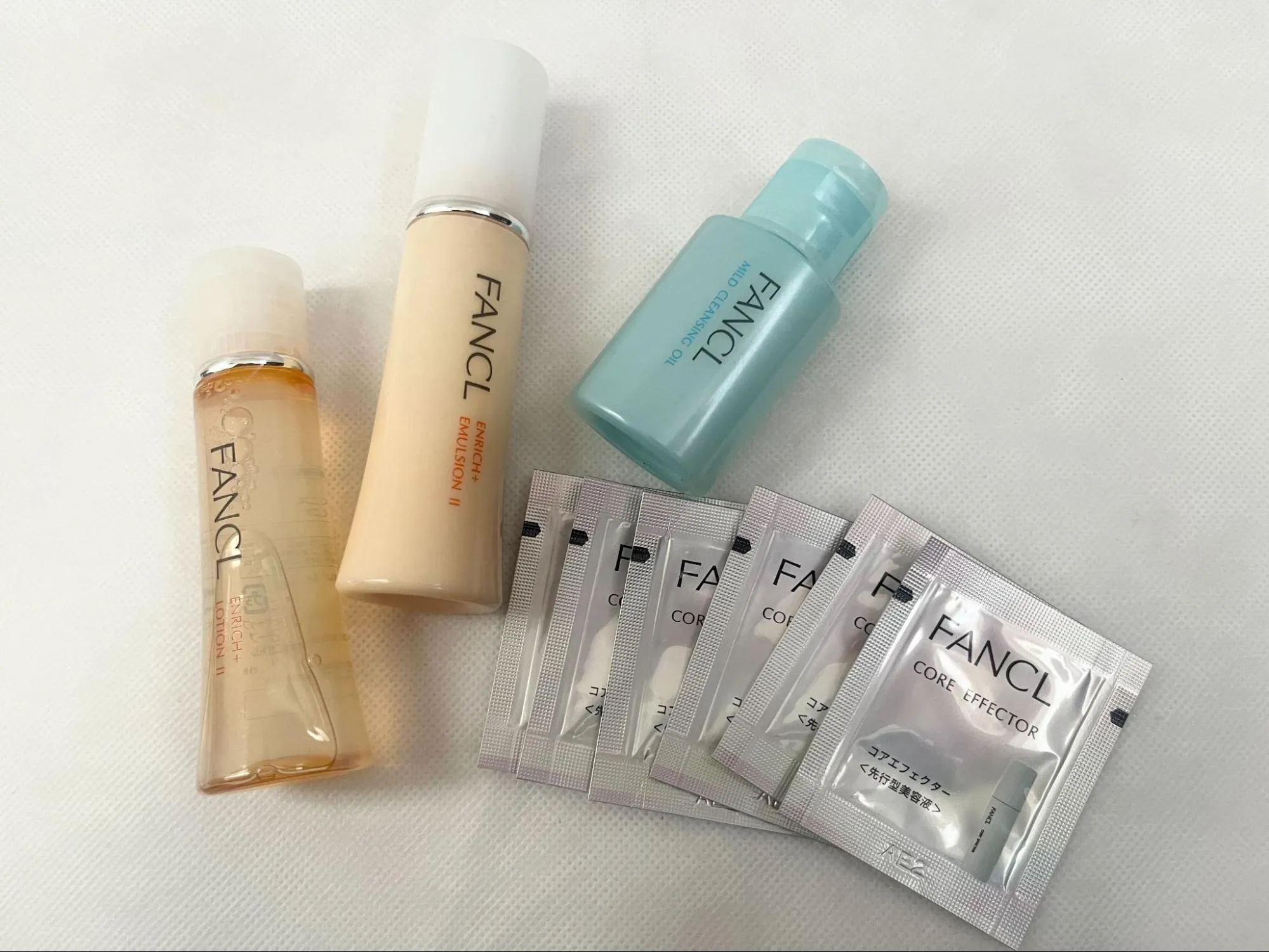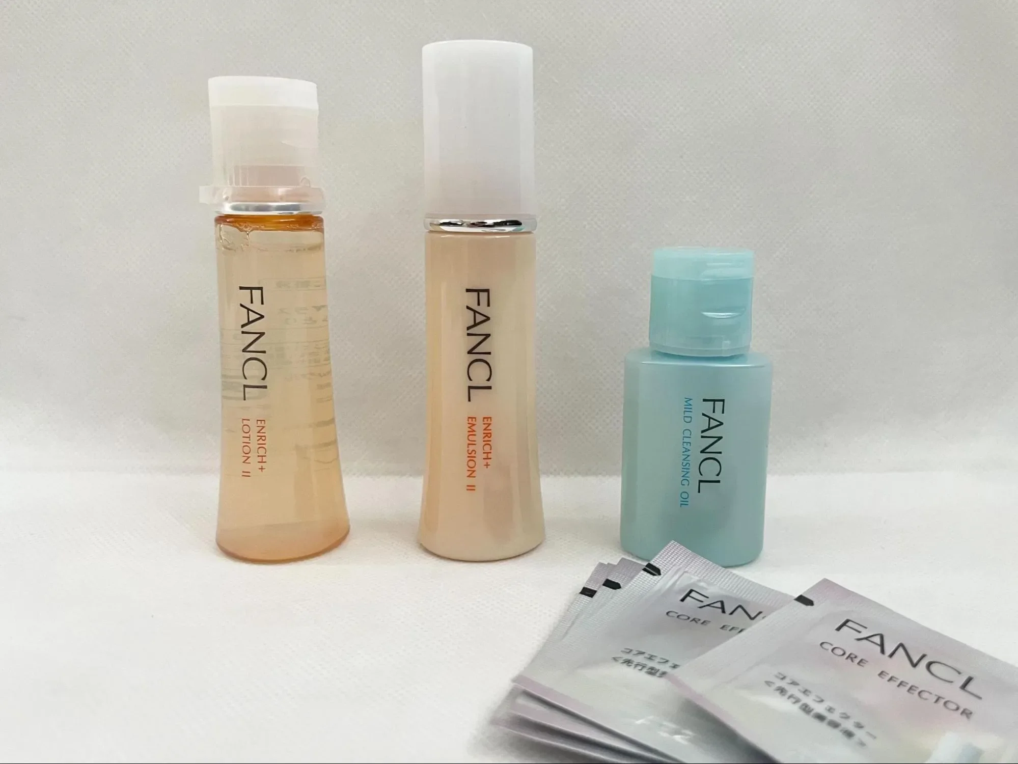 今回のトライアルセットにはファンケルの人気商品「マイルドクレンジングオイル」や、エンリッチプラスと併用して使いたい美容液「コアエフェクター」も付いてきます。そこで、こちらの2アイテムの使用感もレビューしてみました。ファンケルエンリッチプラスと一緒にこれらのアイテムを組み合わせて使うことで、エイジングケア(※)に厚みが出るはずです!