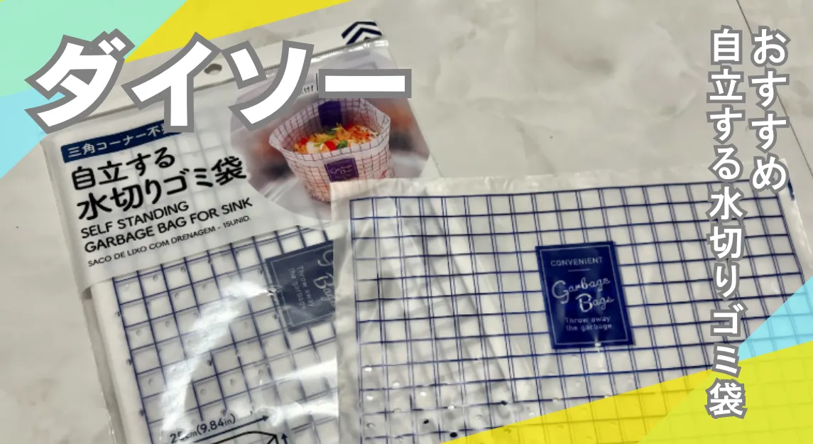 DAISO(ダイソー)で人気のキッチン用品「自立する水切りゴミ袋(15枚)」を実際に購入してレビュー。三角コーナー要らずの自立タイプのゴミ袋は衛生面はもちろん、お手入れも簡単。日々のお掃除を少しでも楽にしたい方におすすめです!