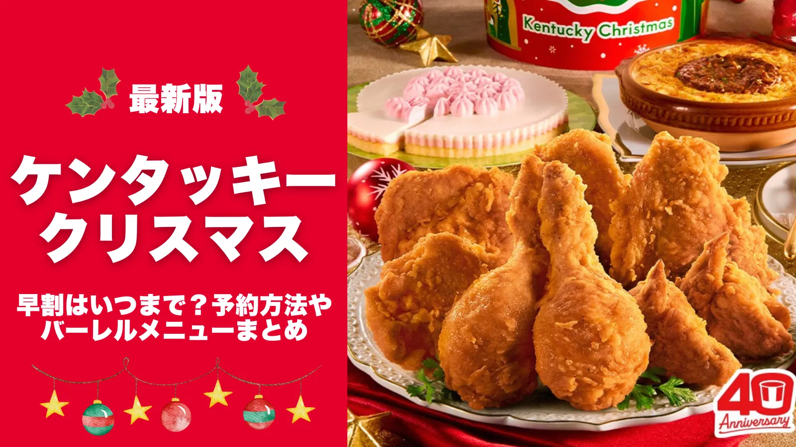 2025年のケンタッキークリスマスの予約がスタート!毎年人気のクリスマス限定メニュー「パーティバーレル」は、12月12日(金)まで500円お得になる「Xmas早割」を実施中です。また、パーティバーレル40周年記念のオリジナルグッズにも注目!メニューの内容や価格、予約の方法までを解説します。「予約はいつからいつまで?」「予約のやり方は?」「当日購入はできる?」といった疑問を解決します。